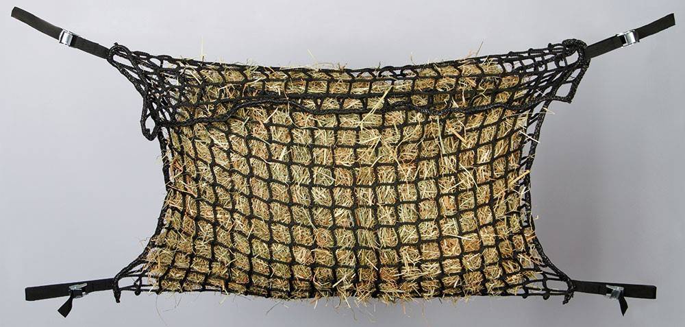 Ce filet à foin résistant est un ""slow-feeder"". Grce aux petites mailles (4 cm x 4 cm) la vitesse d'ingurgitation du foin est ralentie et le temps d'alimentation rallongé.