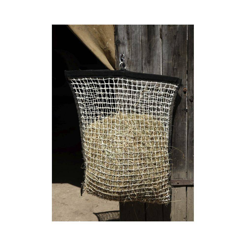 Le Filet à foin Hippo-Tonic dispose de mailles carrées de petite taille (3 x 3 cm) favorisant une absorption lente du foin et une limitation du gâchis de foin dans le box.