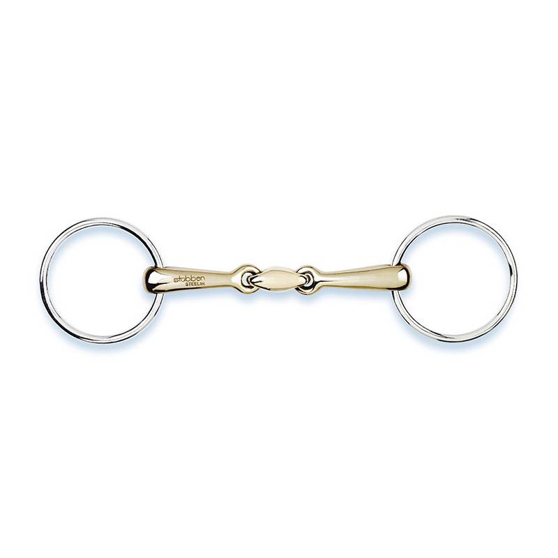 Filet de bride Stubben, modèle 2 anneaux double brisure en cuivre doux avec olive centrale raccourcie pour plus de confort.