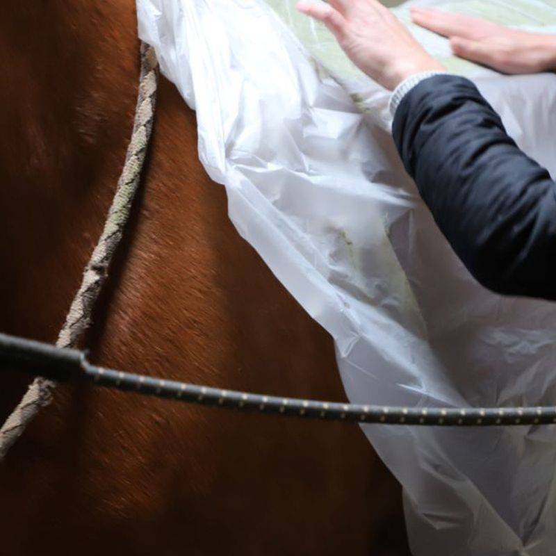 - Indispensable pour favoriser et accélérer l’action des soins posés et garder la chaleur au contact du cheval.