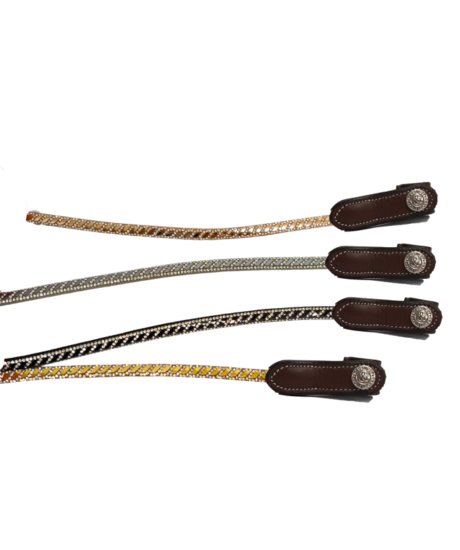 Le frontal brillant Las Vegas de la marque Flags and Cup est conçu pour apporter une touche de sophistication à la briderie de votre cheval. Fabriqué en cuir de qualité, il se distingue par ses pattes amovibles à pression, offrant une flexibilité d'utilisation et un entretien facilité.