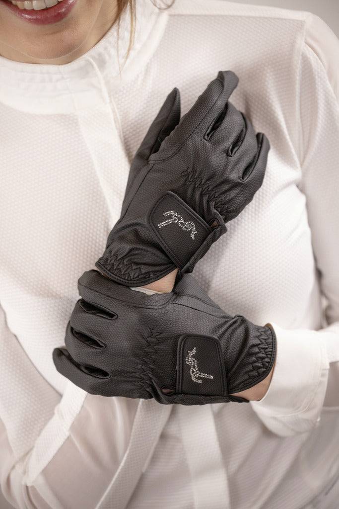 Gants d'équitation Prisma Strass Pénélope très fin et agréable à porter dotés du logo Pénélope en strass sur la patte de fermeture en scratch.