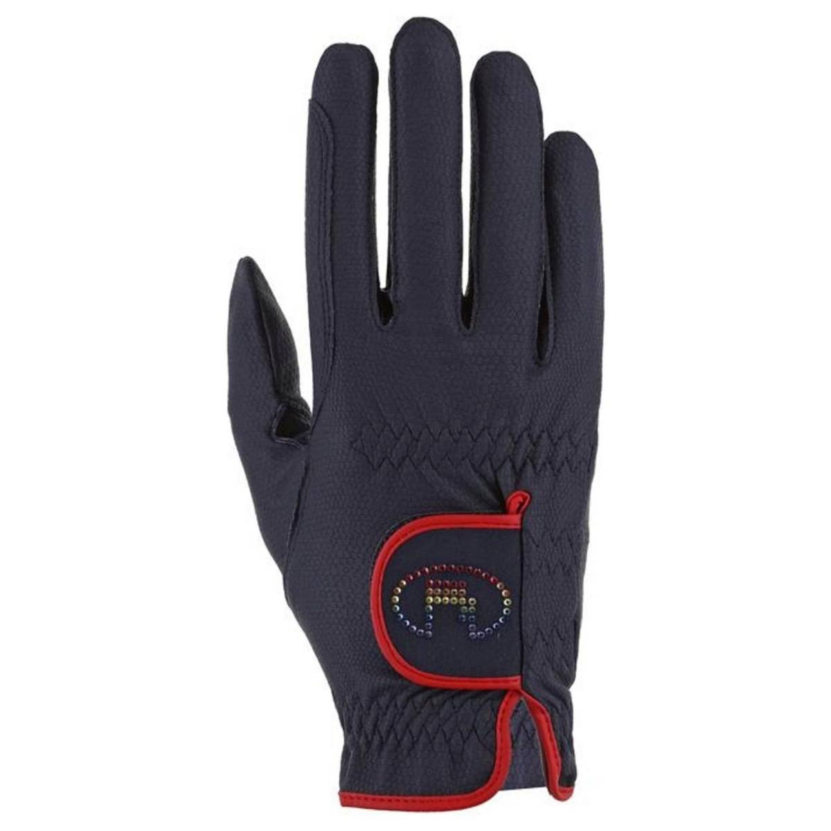 L'élégant bleu marine, le rouge tuck et le blanc classique rencontrent un logo Roeckl Sports fait à la main avec de précieux cristaux Swarovski aux couleurs de l'arc-en-ciel.