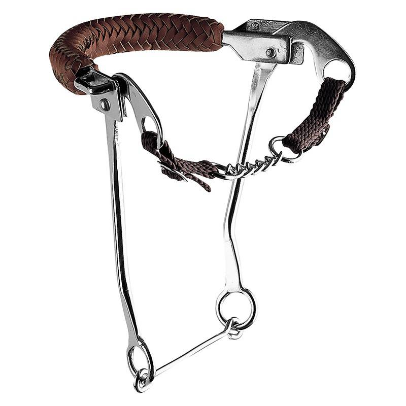 Hackamore de chez Sprenger avec muserolle en cuir tressé de 35 cm de longueur, branches de 24 cm en acier inoxydable.