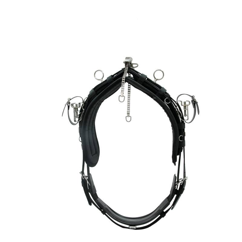 Harnais QH modèle automatique complet, comprend une sellette en véritable biothane avec système d'enrênement automatique, un pad en mousse, une sangle en caoutchouc, une croupière avec culeron à boucles, une bricole type à la française, une paire de guides avec poignées avec dés pour fixation de débouche oreilles ainsi qu'une bride complète avec enrênement et tour de nez de muserolle.