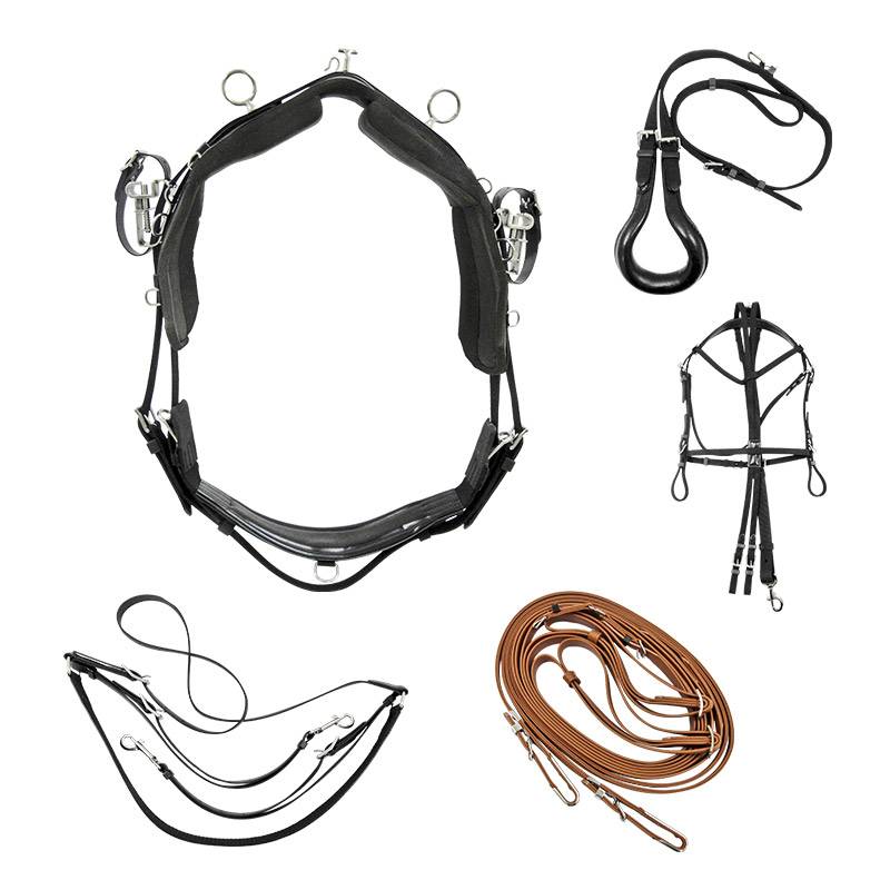 Ce harnais QH pad cousu complet est conçu pour offrir un excellent contact avec le dos du cheval grâce à sa sellette en véritable biothane avec un pad en mousse cousu. Il comprend également une sangle en caoutchouc, une croupière avec culeron à boucles, une bricole de type français, une paire de guides avec poignées et des dés pour la fixation de débouche-oreilles, ainsi qu'une bride complète avec enrênement et tour de nez de muserolle.