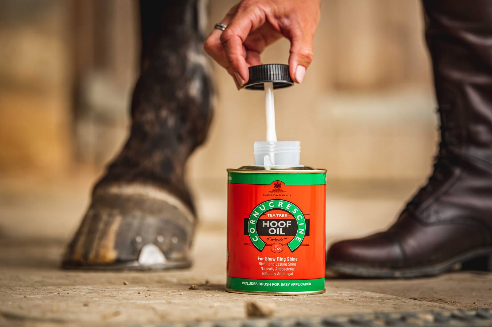 Découvrez l'huile pour sabots de Carr & Day & Martin, formulée avec des extraits d'arbre à thé, conçue pour offrir une protection efficace et une finition brillante à vos chevaux.