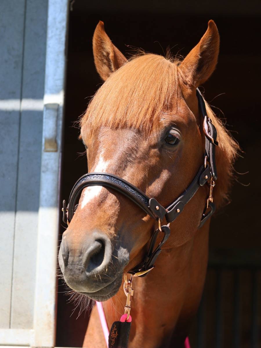 Ce licol en cuir marron se distingue par sa bande de disco noir sur la muserolle et la têtière, ajoutant une touche d'élégance à votre équipement équestre. Les boucles en or rose complètent ce design raffiné, offrant une esthétique moderne et chic.