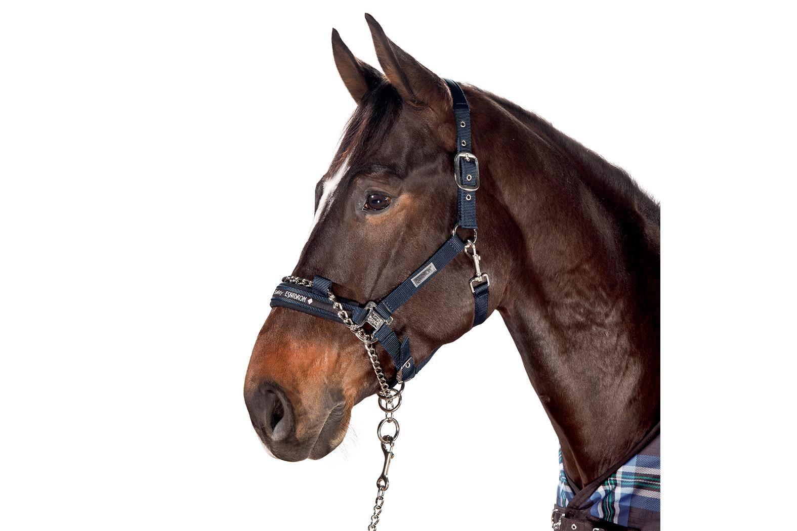 - La muserolle de ce licol est équipée d'une chaîne qui a pour but une action éducative et plus efficace.