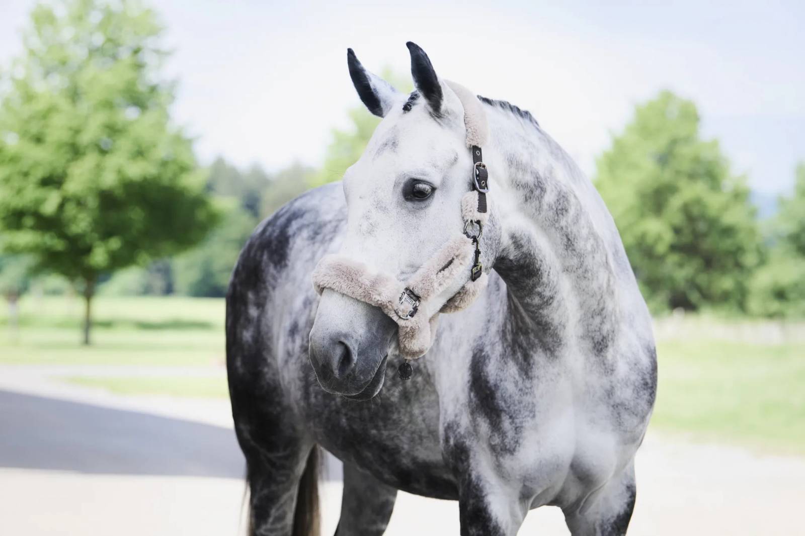 • Licol de transport en fausse fourrure • Rembourrage en fausse fourrure doux, facile d'entretien et complet • Sangle indéchirable de haute qualité • Boucles à ardillon des deux côtés pour un réglage optimal • possibilité de réglage supplémentaire au niveau du menton • Ferrures en métal brillant de haute qualité • Plaque métallique Eskadron supplémentaire sur le côté gauche