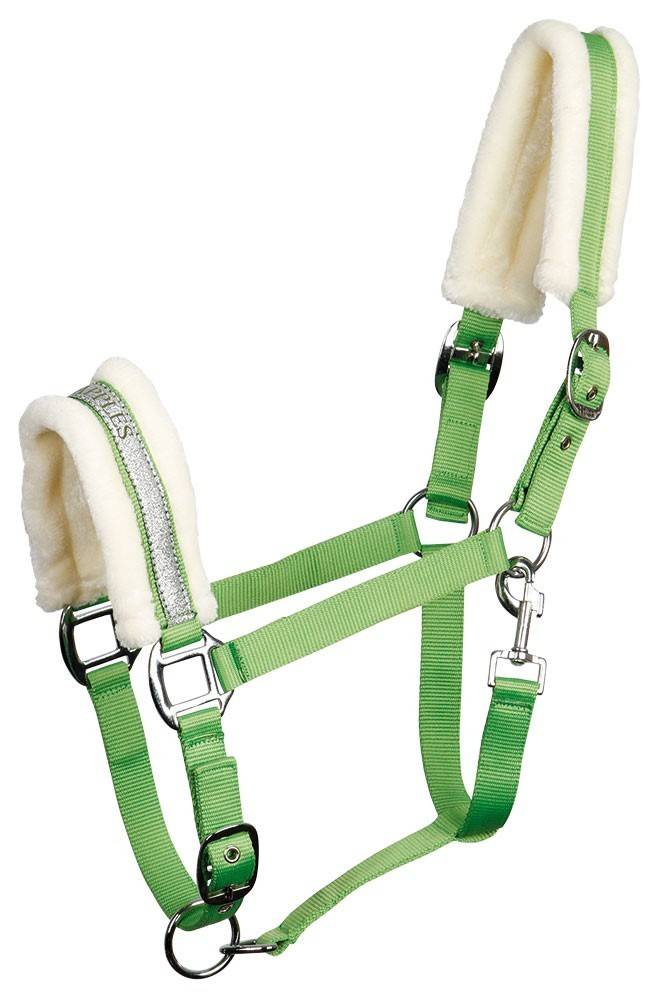 Licol doublé de fausse fourrure, décoré avec une bande argent avec écriture sur la muserolle. Têtière doublement réglable et muserolle réglable. Trous renforcés avec des oeillets.