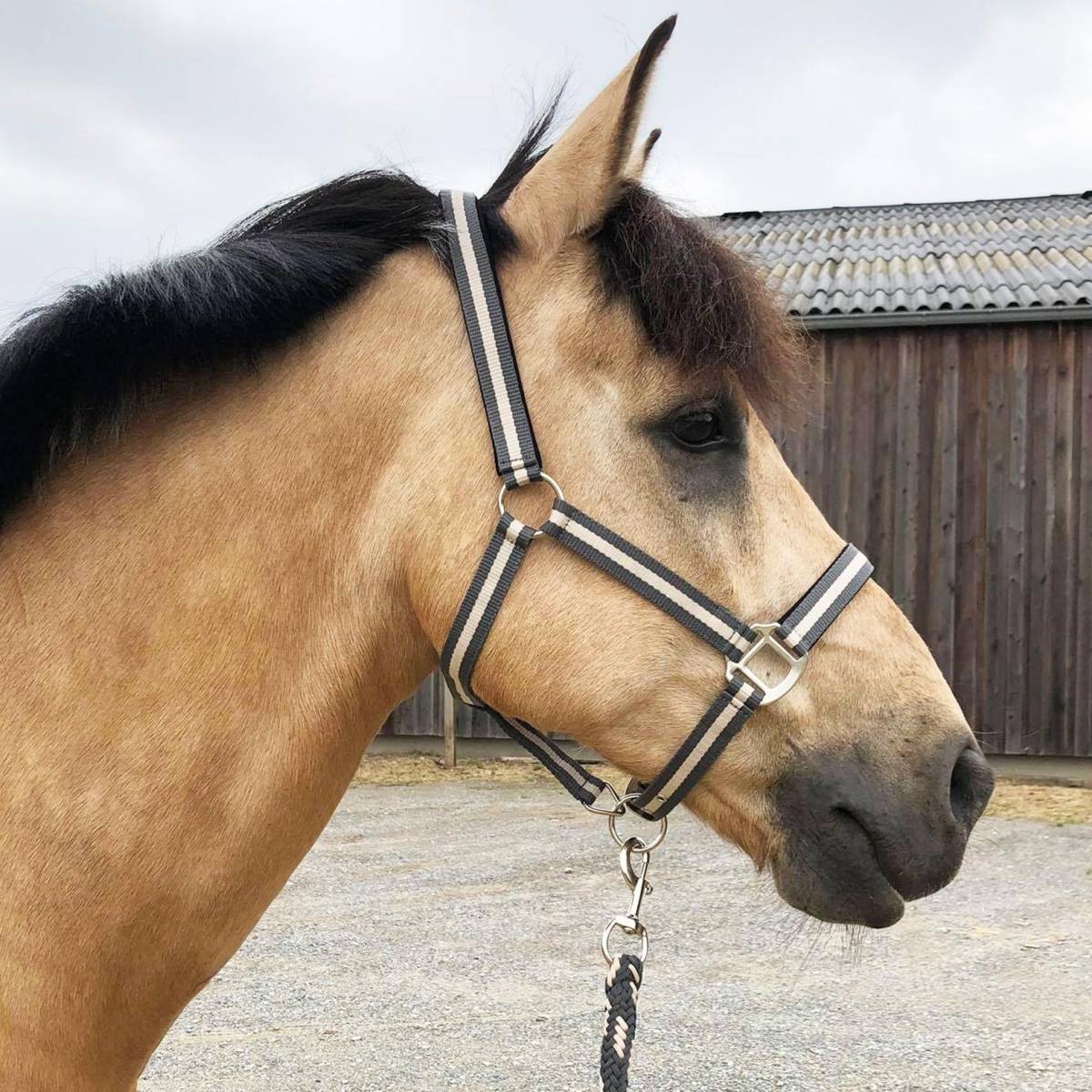 Le licol nylon doublé avec longe assortie en couleur gris et beige de chez JMR est doublé à la têtière et la muserolle pour un confort parfait pour le cheval.