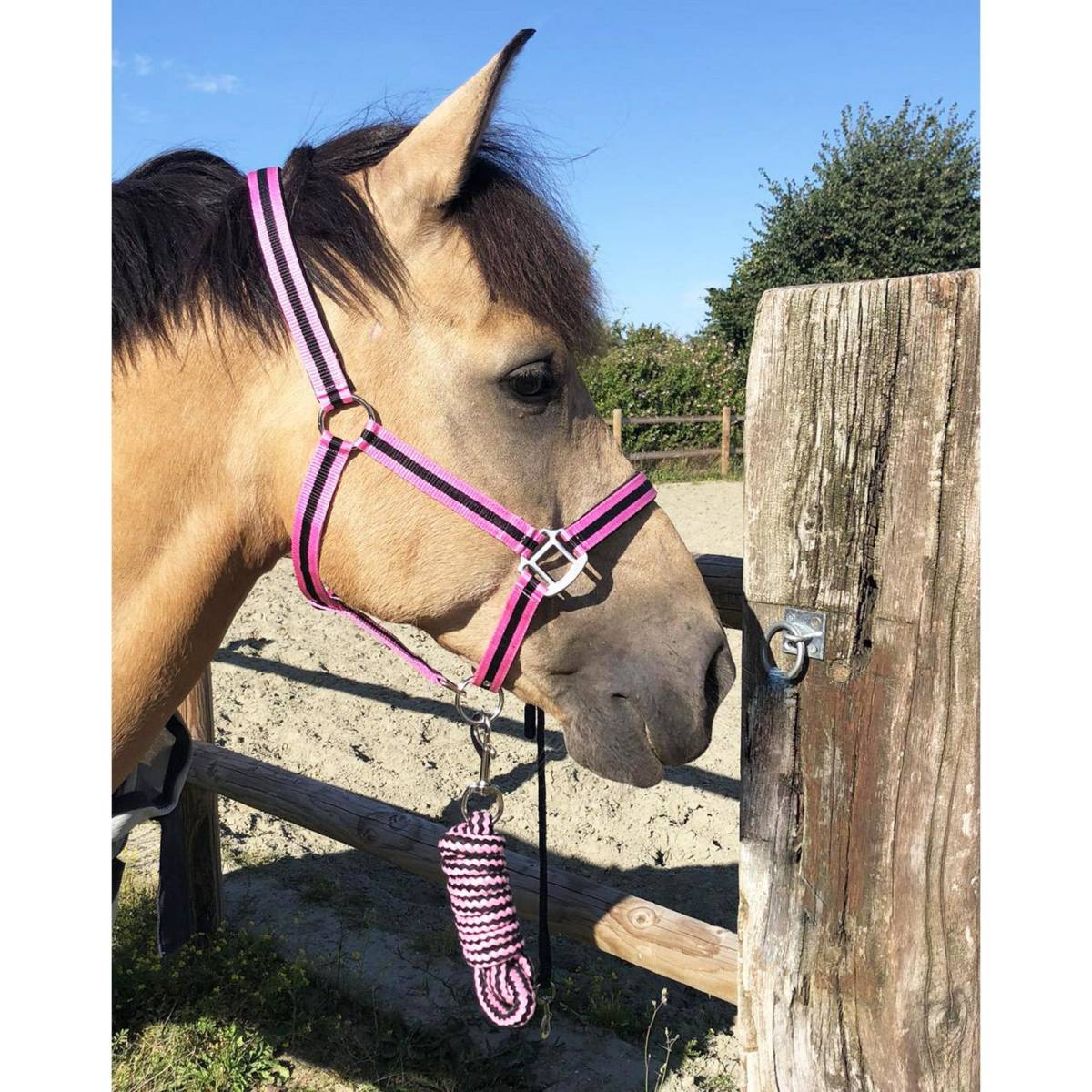 - Le licol nylon rose et noir de chez JMR est vendu avec la longe dans les mêmes coloris.