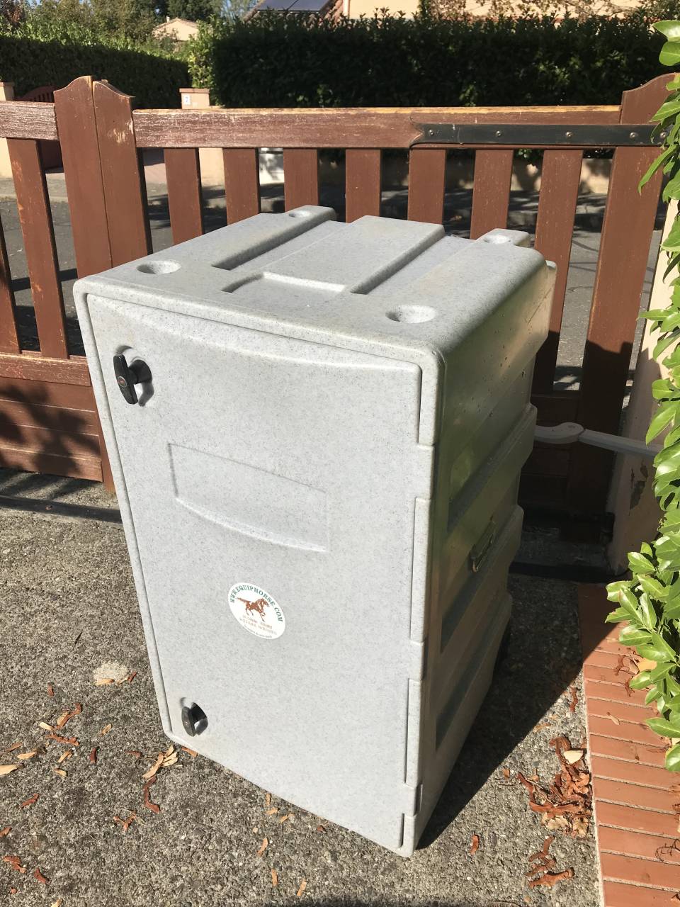 C’est une malle en polyéthylène très robuste, volumineuse et stable car assez lourde. La malle est percée au bas de chaque flanc d’une grille d’aération. L’une des grilles a un trou élargi un jour par un animal mais il est facilement obturable.
