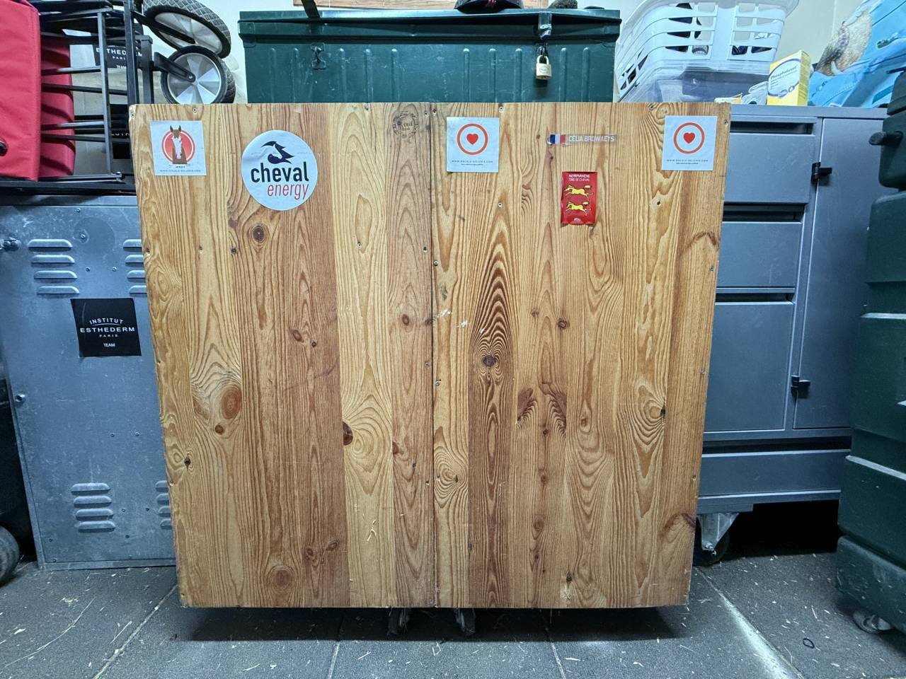 Malle de rangement sellerie. Elle possède : un porte selle, 2 grands tiroirs, 3 portes filets, 3 grandes étagères, 2 crochets qui ont été rajouté.