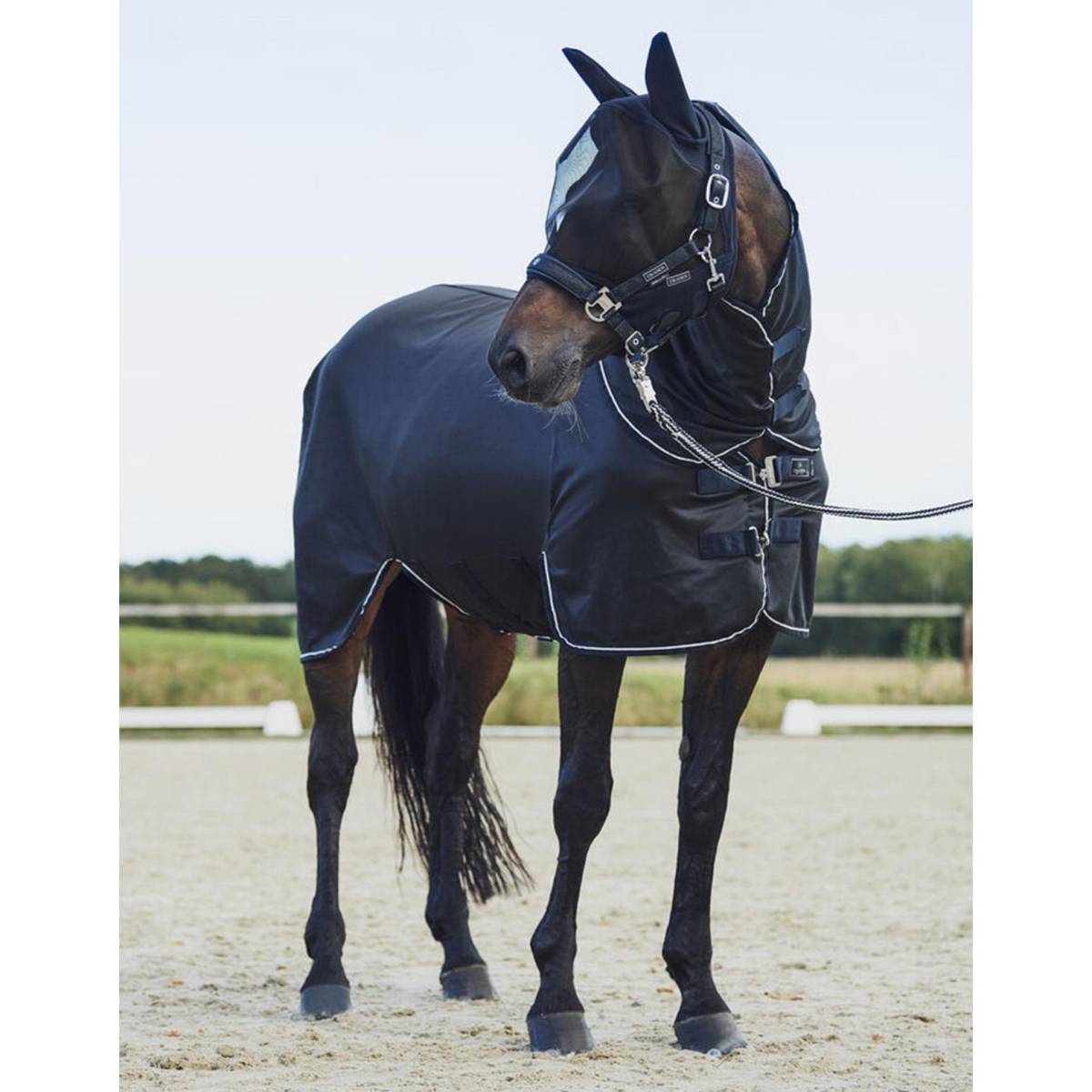 Le voile bleu marine au niveau des yeux participe à protéger votre équidé contre les rayons UV du soleil.