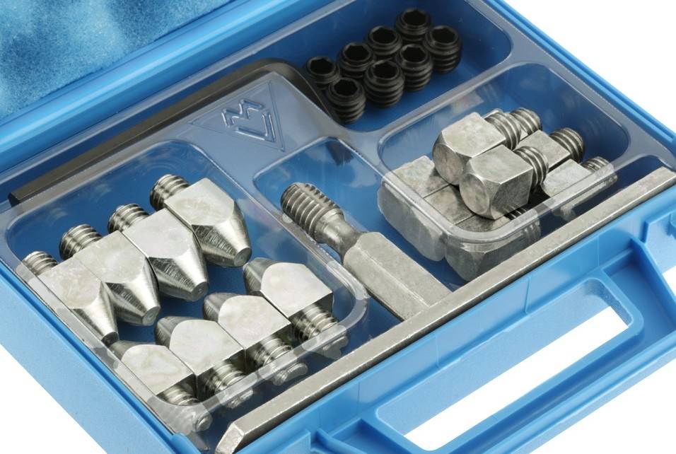 Mini-mallette bleue comprenant un assortiment de crampons standard répartis en deux tailles, bouchons et clés.