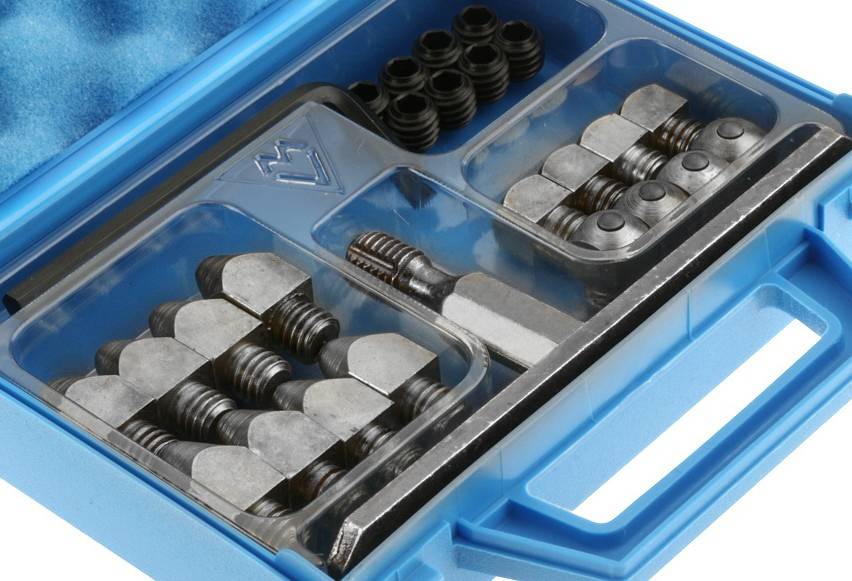 Mini-mallette bleue comprenant un assortiment de crampons tungstène répartis en deux tailles, bouchons et clés.