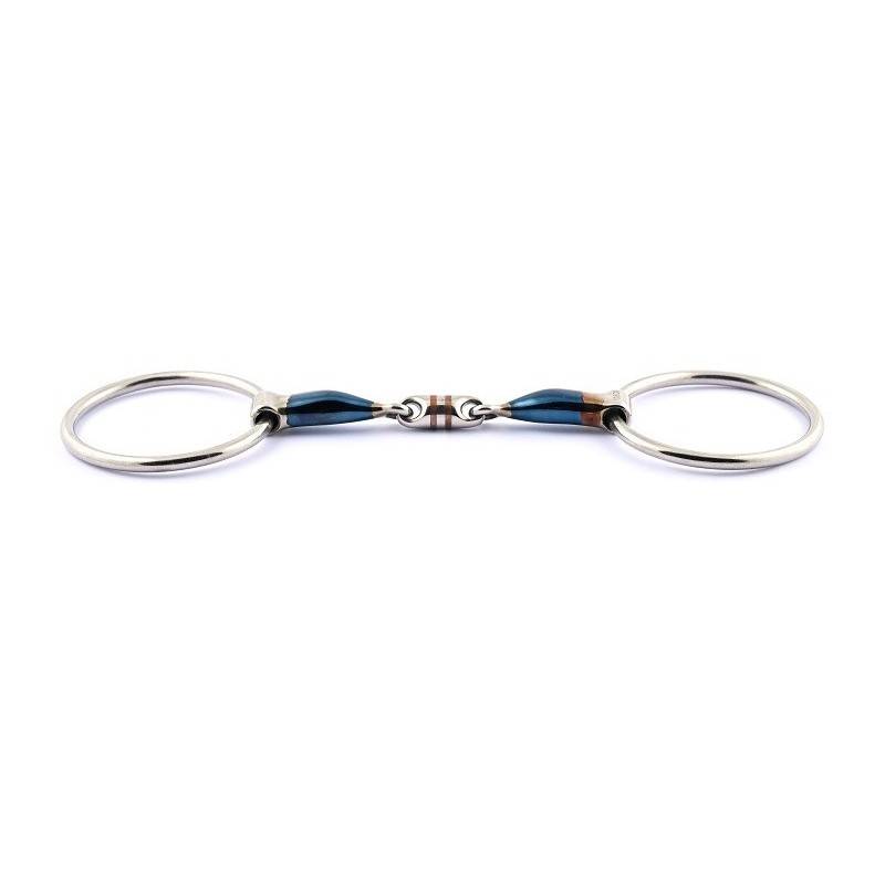 Conseil d'utilisation: Le Mors Blue Steel double brisure est l'embouchure la plus canalisante pour les problèmes directionnels. Son alliage qui s'oxyde avec le temps favorise la décontraction du cheval dans le travail. Les incrustations en cuivre et les anneaux de cuivre sur la brisure centrale contribuent également à favoriser la décontraction en bouche.