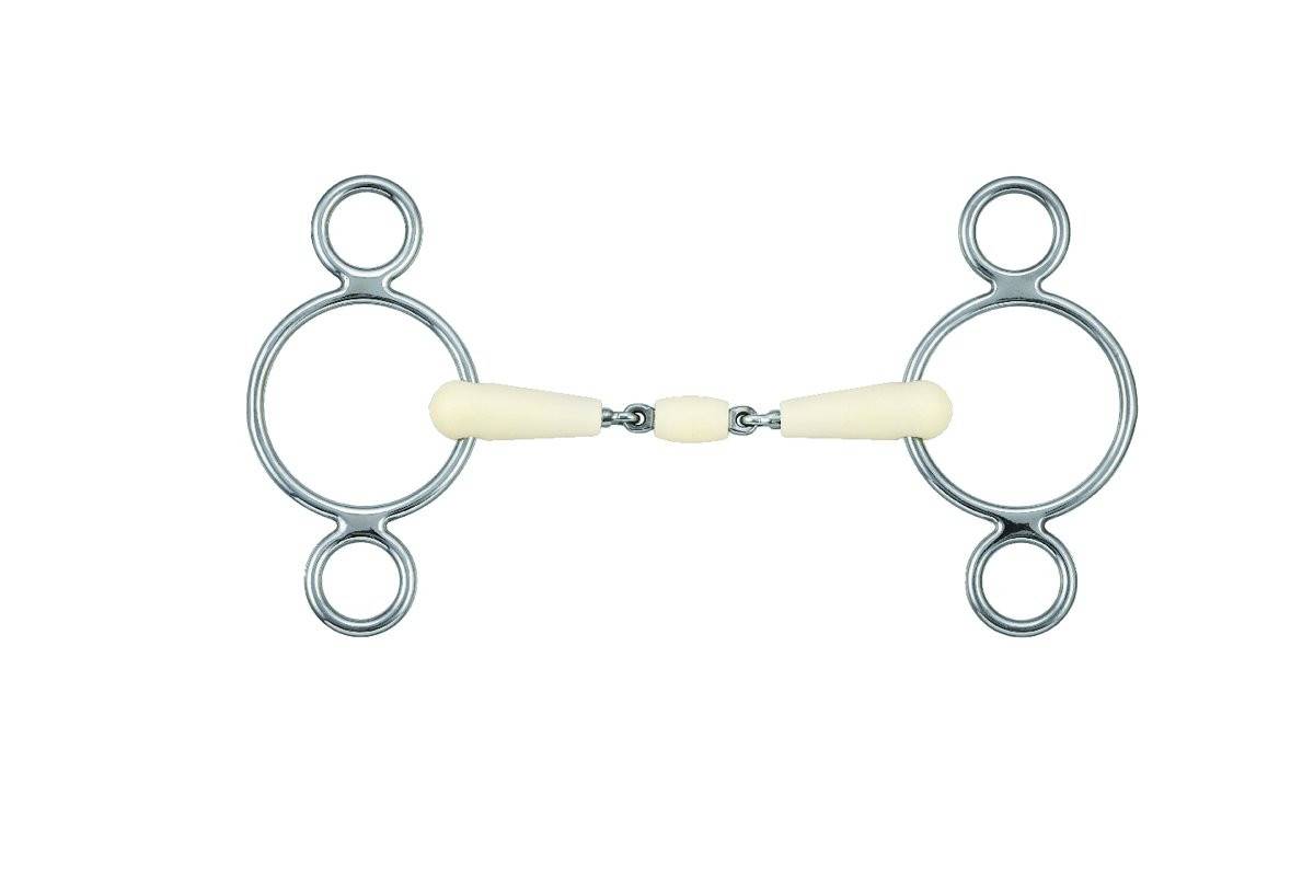 Le mors double brisure Pessoa 3 rings de la marque Happy Mouth est conçu pour offrir une expérience de conduite agréable, tant pour le cavalier que pour le cheval. Sa conception unique en résine parfumée à la pomme favorise le bien-être buccal de votre monture.