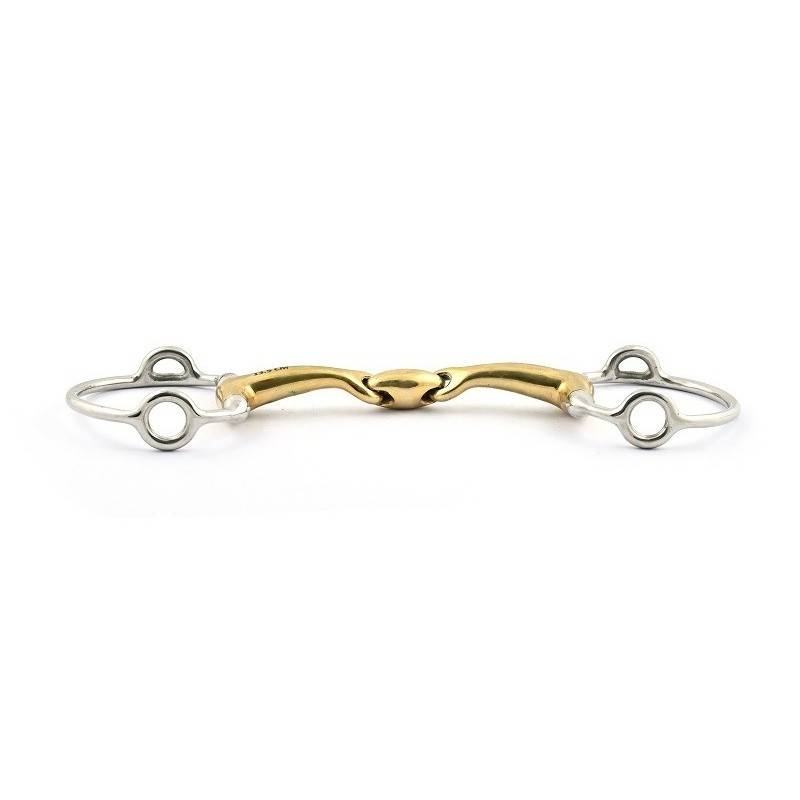 Composition du Mors releveur à olives double brisure Jump'In: ce mors est composé d'anneaux de 70 mm et d'un canon standard de 14 mm en German Silver. Cet alliage décontractant et solide, composé à 65% de cuivre, 23% de zinc et 12% de nickel, offre une résistance et une action optimale.