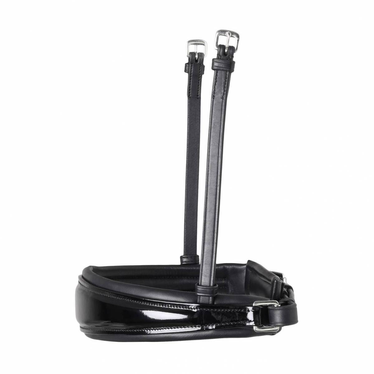 Muserolle large avec les bords plus fins pour permettre un meilleur passage du mors. La muserolle est souple avec une bande vernie sur l'avant.