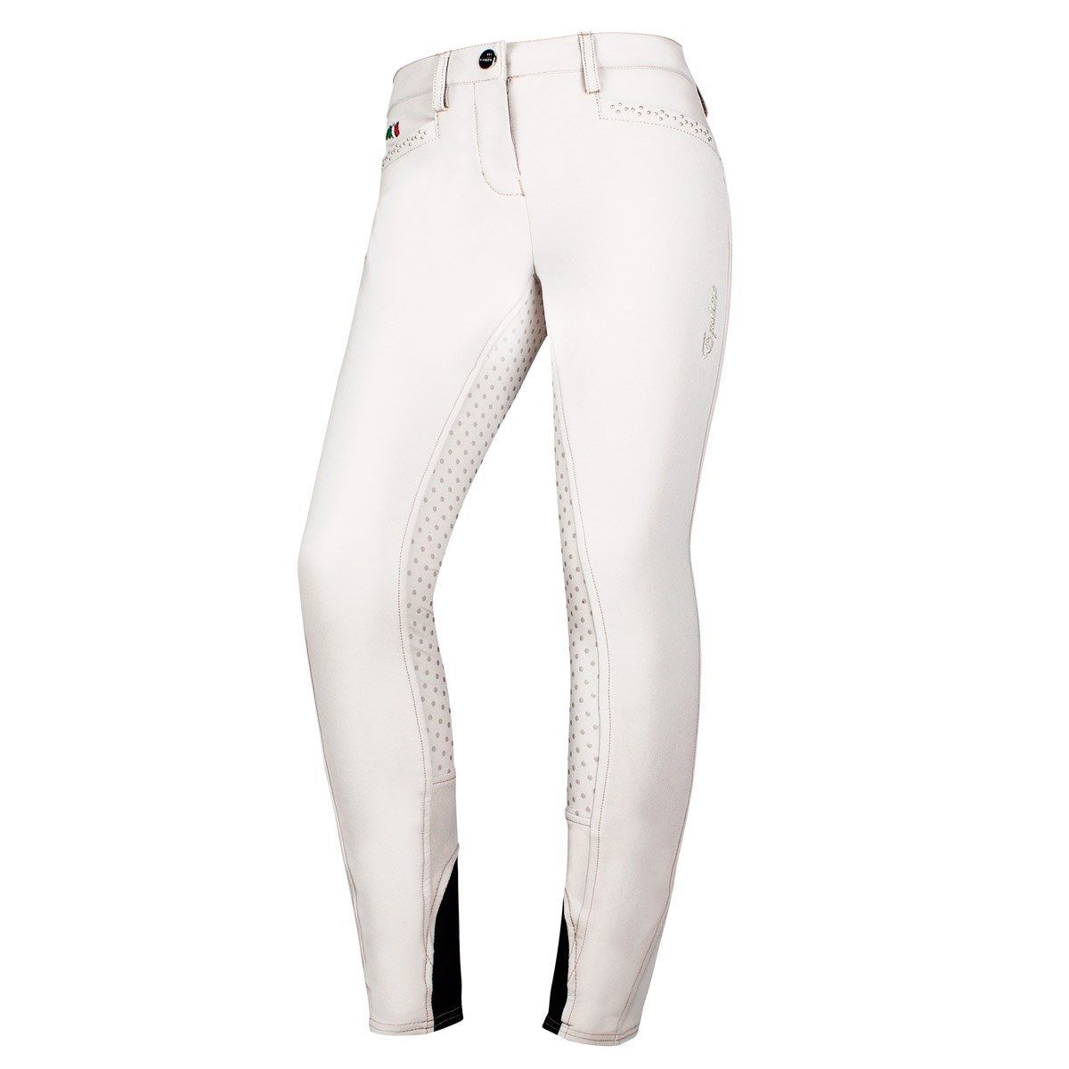 Pantalon d'équitation concours Fille Clodette Full Grip Blanc Equiline de la collection Junior Equiline avec décoration sur les poches avant et arrières.
