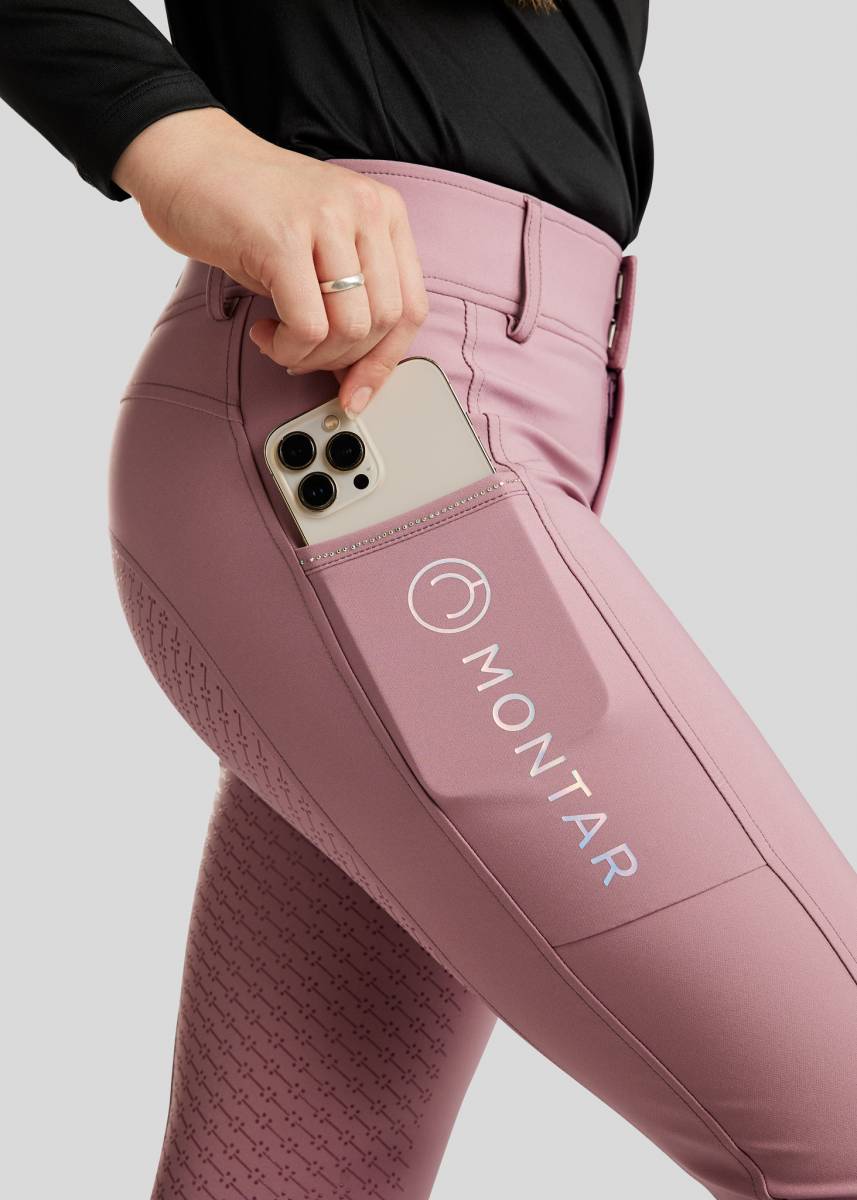 Doté d'une taille haute, ce pantalon offre un ajustement optimal et un confort accru. Il est équipé de deux poches latérales spécialement conçues pour accueillir un téléphone, dont l'une est décorée de l'écriture Montar et de cristaux holographiques pour une touche d'élégance. Le full grip en silicone assure une adhérence parfaite en selle.