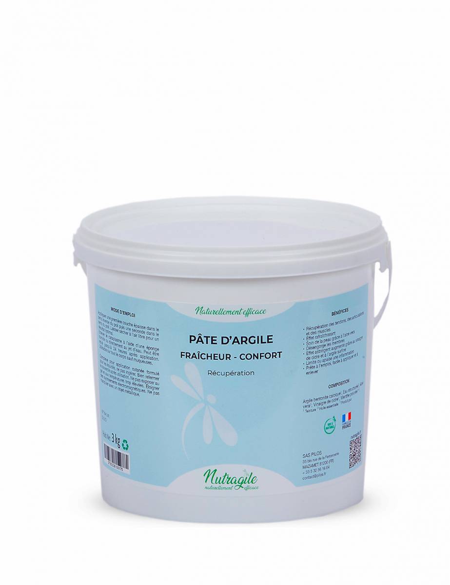 De l'eau Structurée. Elle est extrêmement importante dans l’efficacité de notre cataplasme, nous y accordons la plus grande attention. Nous utilisons dans notre recette une eau à la structuration très particulière dépolluée de toutes charges électromagnétiques (facteur essentiel pour optimiser le phénomène d’adsorption naturel de l’argile bentonite.)
