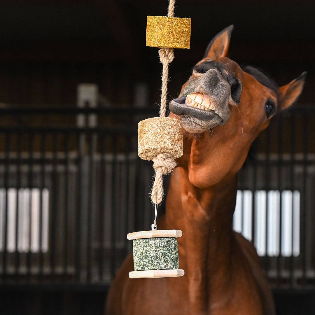 Suspendre le bloc devant le box de votre cheval, sans point d’appui à proximité, de préférence sur un support pour le faire durer.