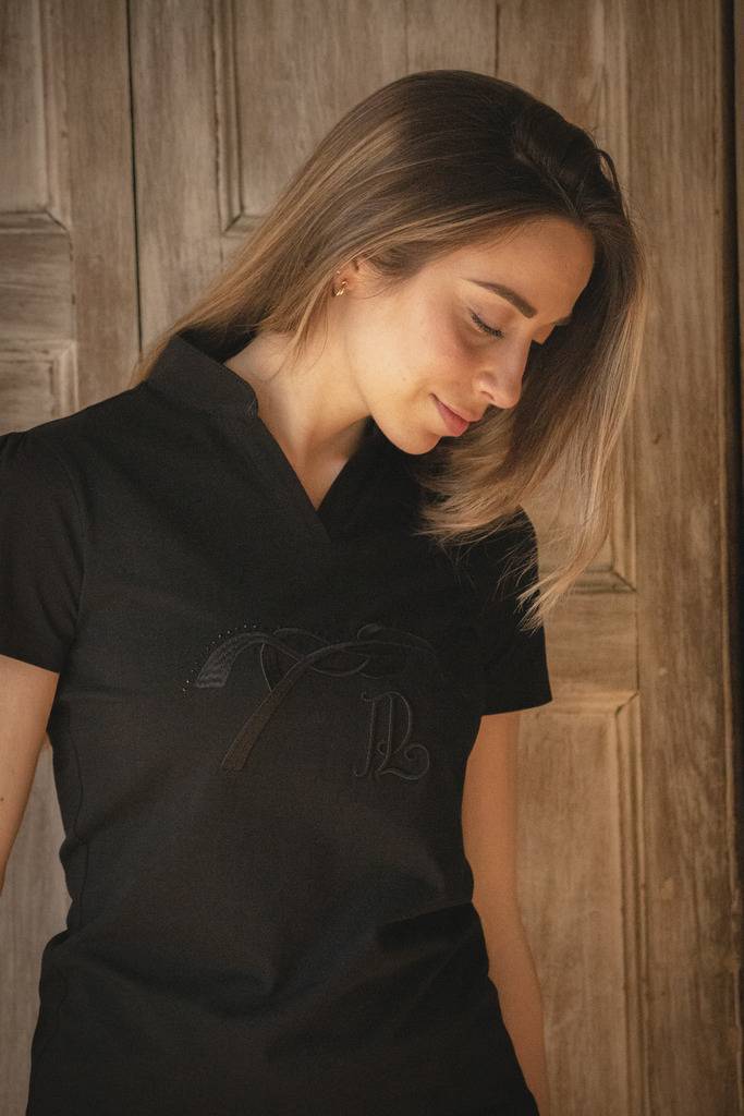 Polo "Iliana" doté de manches courtes, d'un col V qui prolonge petit col officier et d'un broderie en 3D Pénélope rehaussé d'un rang de strass. Ce polo se porte aussi aux écuries avec un pantalon d'équitation, qu'en ville avec un jean.