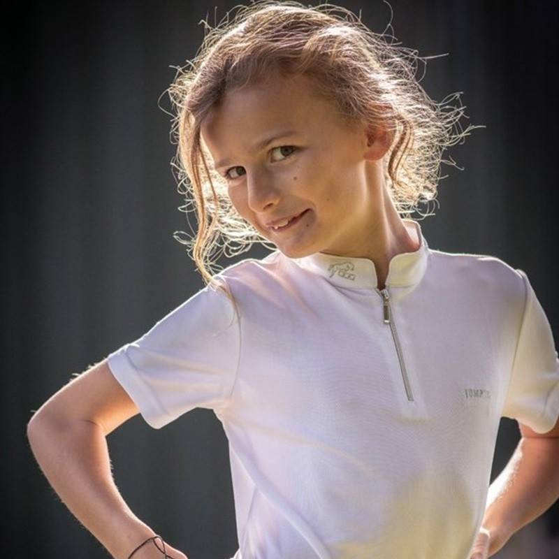 Polo de concours - Charlie Jump'in Modèle manches courtes spécialement conçu pour la pratique du concours hippique. Le polo Charlie est composé d'un joli col officier, d'une fausse poche poitrine sur laquelle on retrouve le logo Jump'in en gris et de manches courtes découpées. Il se ferme par deux un petit zip argenté sous le col. Disponible en blanc, marine et rose 100% micro polyester Il est disponible du 10 au 18 ans Conseil de taille : Ce polo taille normalement, vous pouvez choisir votre taille habituelle. Conseil de lavage : en machine à 30°C, pas de sèche-linge.