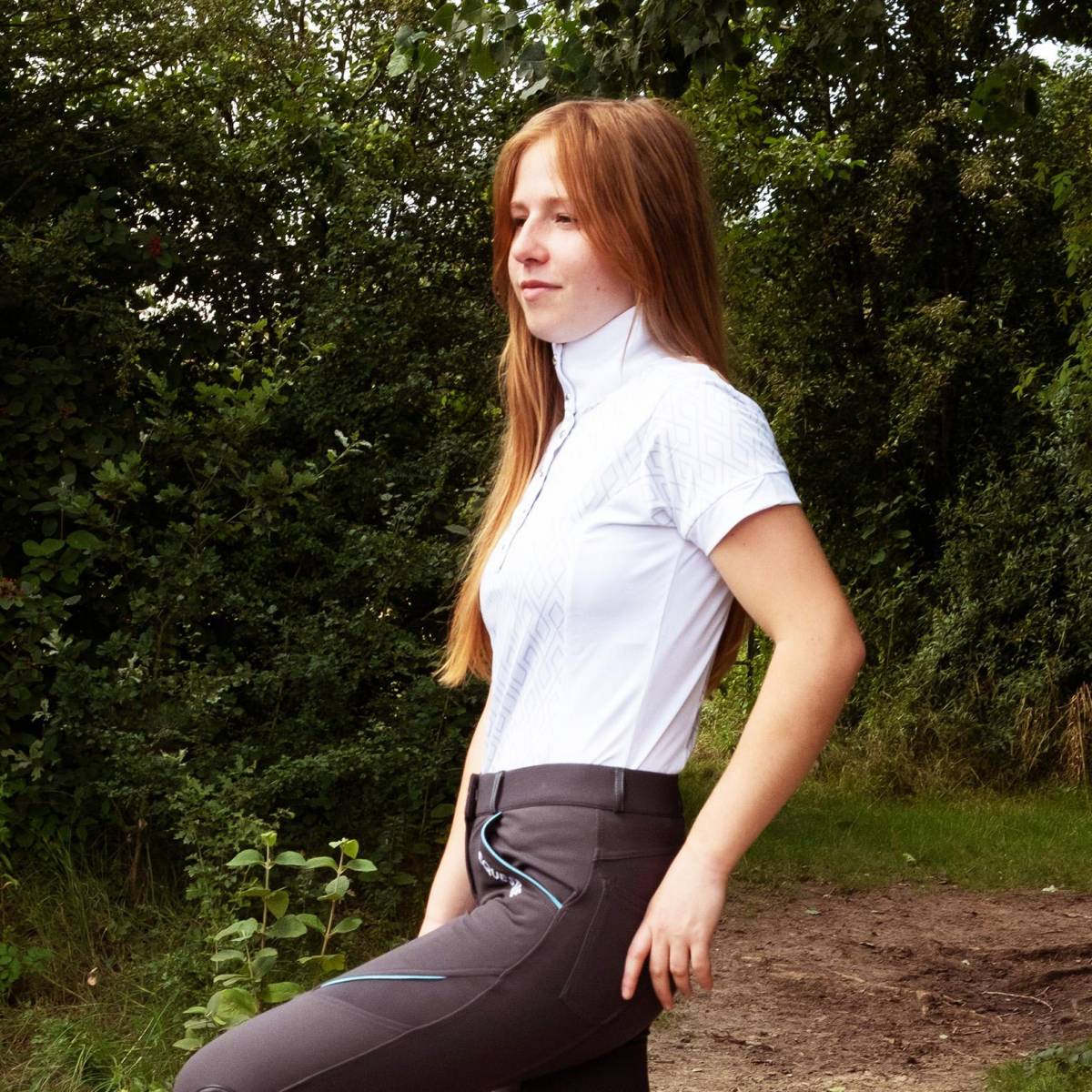 Ce dessus de concours Divine de chez Equestre à col haut est originale avec son design géométrique gris sur fond blanc et, sa fermeture avec 6 boutons en "pierres" argentées.
