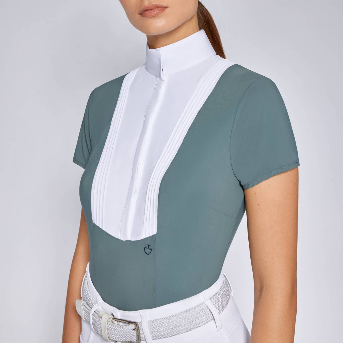 Polo de concours à manches courtes en couleur bleu pétrole (peacock green) avec un col montant. Beau plastron sur le devant avec des détails plissés et des boutons cachés.