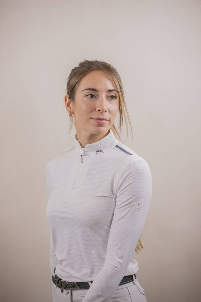 Le Polo de concours Séville Mesh Manches Longues et confectionné dans un tissu blanc micro-perforé, fluide, léger et respirant. Très chic, son col officier se ferme à l'aide d'un zip surmonté d'un bouton. Bien ajusté, son col est estampillé d'une petite breloque logotée argentée. Un passepoil plat bleu gris et un petit empiècement blanc dessinent délicatement l'épaule pour une jolie silhouette. Sur la manche gauche, logo Pénélope apparaît dans une matière type gomme.