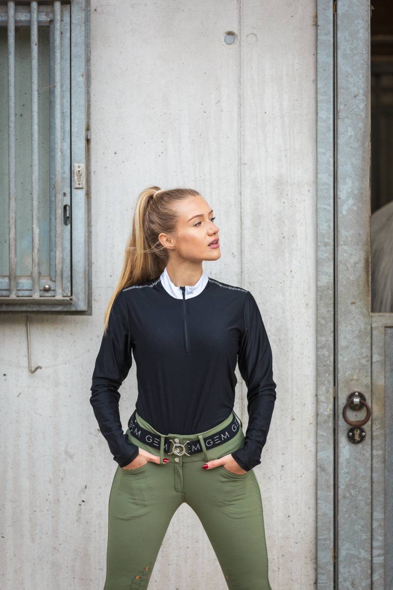 Polo de concours manches longues, le modèle Tinder de GEM est conçu pour vous mettre en valeur lors des compétitions. Avec ses logos GEM en paillettes au dos, ce polo se distingue par sa matière perforée thermorégulatrice qui assure une excellente gestion de la température. Sa fermeture zippée et ses empiècements en tulle aux manches et au bas ajoutent une touche d'élégance et de modernité.