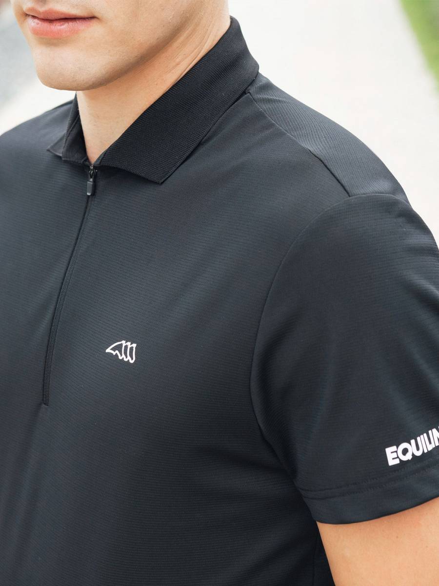 - Polo de loisir bleu marine pour homme avec ouverture frontale zippée, logo Equiline imprimé en blanc sur la poitrine et mot Equiline sur la manche.