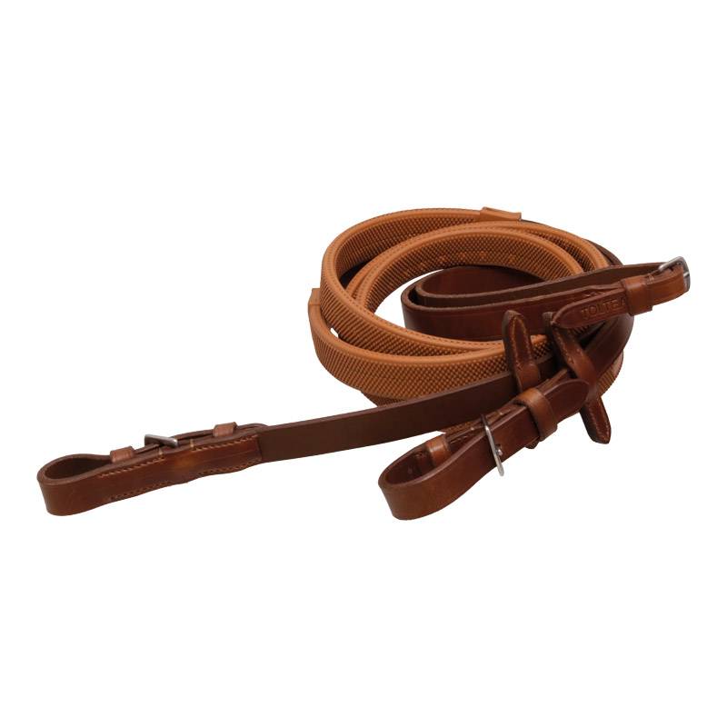 Découvrez les rênes d'exercice en cuir et mains de rênes caoutchouc de la marque Tolteam, conçues pour offrir une prise en main confortable tout en garantissant une grande durabilité.