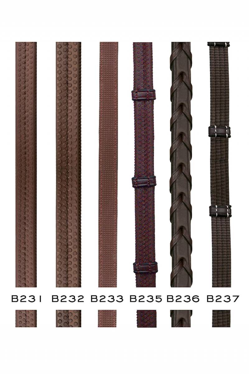 - La B235 sont des rênes en caoutchouc souple avec 7 arrêtoirs en cuir . Largeur 13 mm