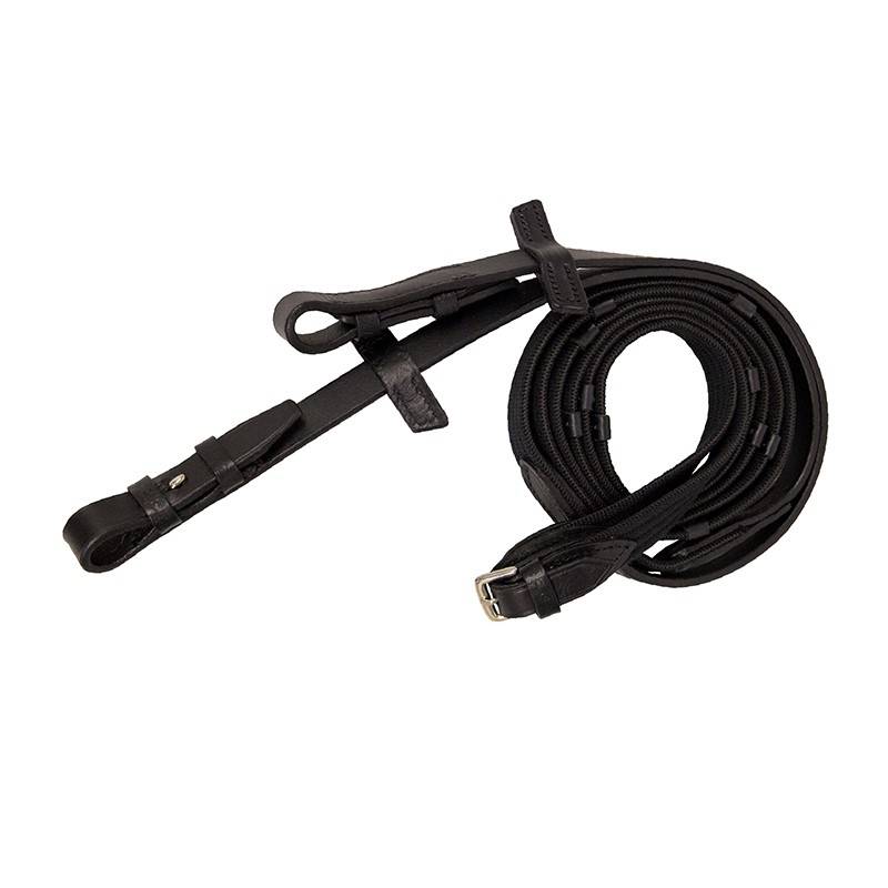 Rênes fines Stubben, en sangle avec 5 arrêtoirs et attaches au mors par crochets.