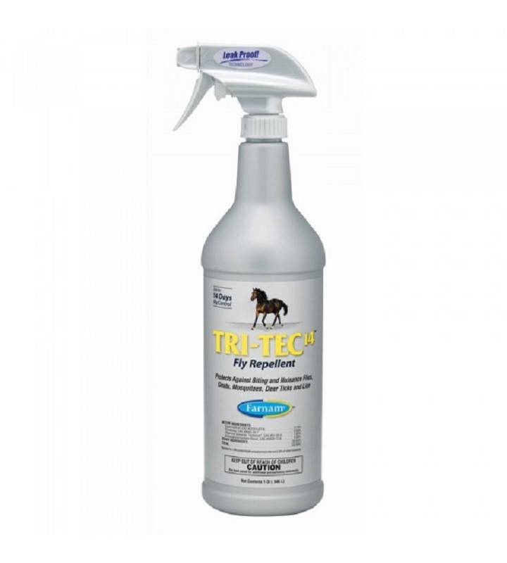 TRI-TEC 14 spray de 946ml est un insecticide prêt à l’emploi, contre mouches, taons, tiques, moustiques et autres insectes rencontrés dans l’environnement du cheval