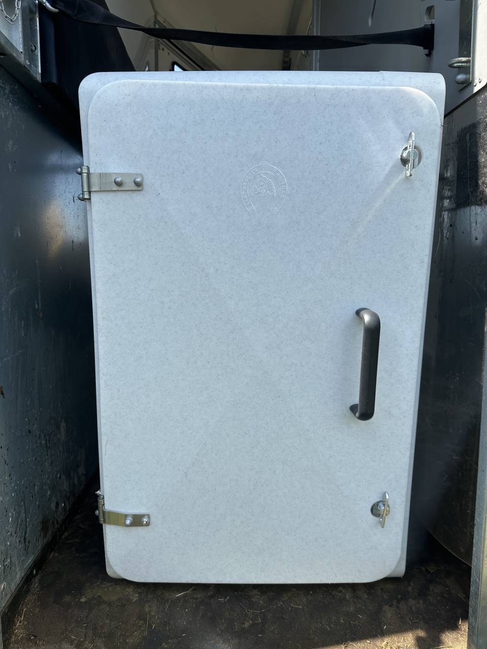 Coffre à selles prêt à monter ouverture porte vers la gauche.