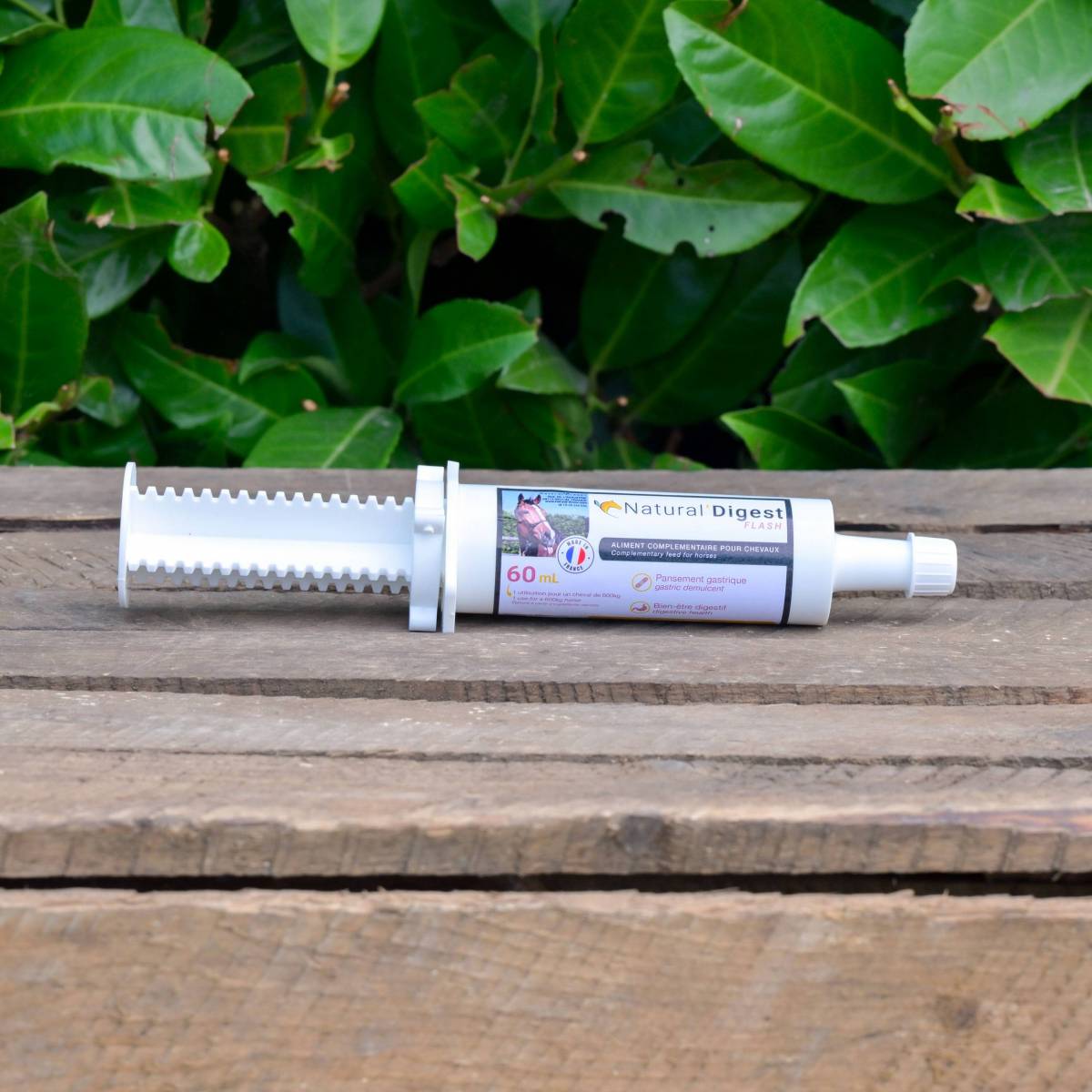 Natural'Digest FLASH est un complément alimentaire spécifique visant à protéger l'estomac sensible du cheval, sous forme de pâte en seringue orale de 60 ml.