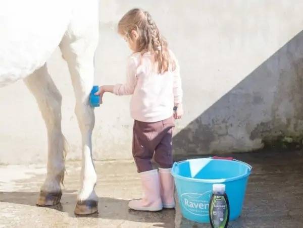 Verser directement EASY SHINE Grey sur le cheval préalablement mouillé, frotter et masser avec une brosse douce et faites mousser. Rincer à l'eau.