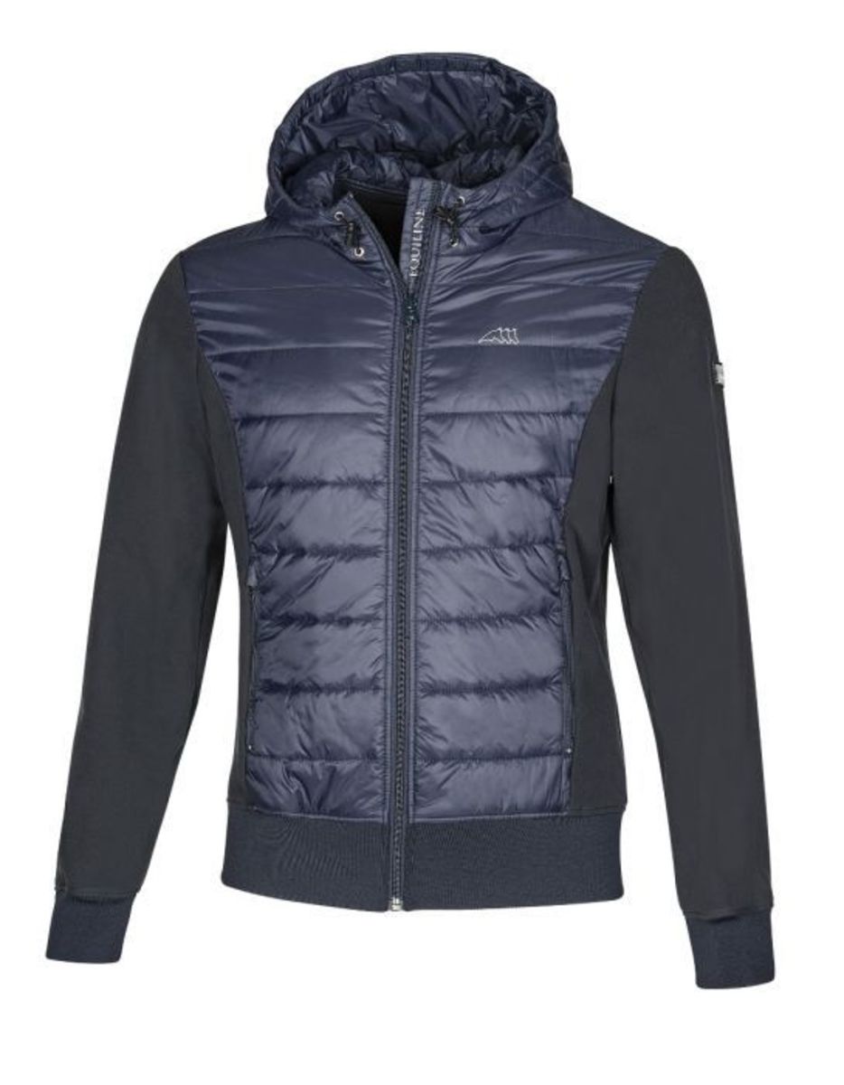 Veste à capuche homme à double technologie. Fabriquée de tissu extensible et respirant, le devant et le sweat à capuche sont matelassés, le sweat à capuche est ajustable, zippé à l'avant.