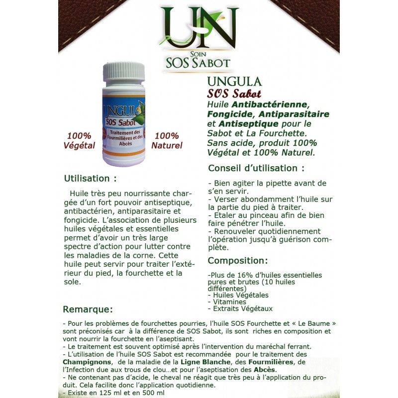 - Pour les problèmes de fourchettes pourries, l’huile SOS Fourchette et « Le Baume » sont préconisés car à la différence de SOS Sabot, ils sont riches en composition et vont nourrir la fourchette en l’aseptisant. - Le traitement est souvent optimisé après l’intervention du maréchal ferrant. - L’utilisa on de l’huile SOS Sabot est recommandée pour le traitement des Champignons, de la maladie de la Ligne Blanche, des Fourmilières, de l'Infection due aux trous de clou et pour l’aseptisation des Abcès. - Ne contenant pas d'acide, le cheval ne réagit que très peu à l’application du produit. Cela facilite donc l’application quotidienne.