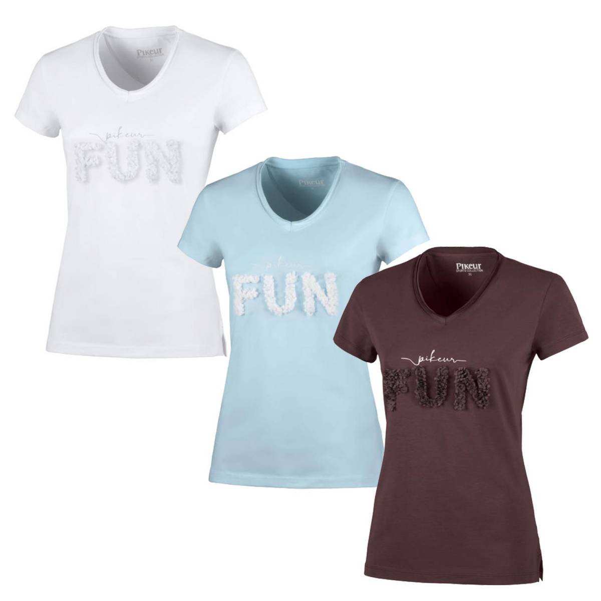 Ce dessus pour dame est très élégant avec le nom Pikeur brodé et le mot "Fun" mis à l'avant du t-shirt en froufrou style fleurs.