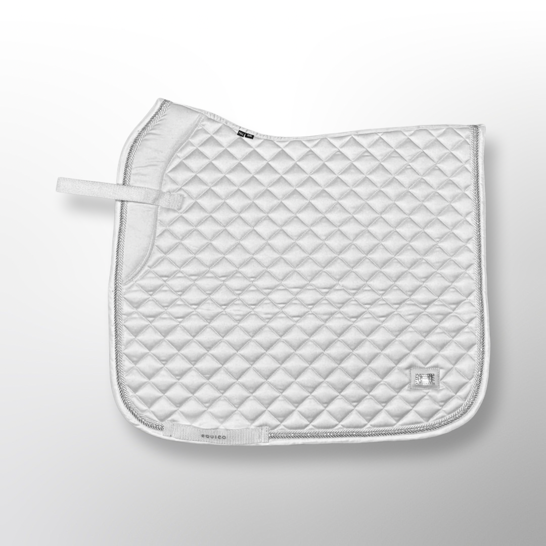 Tapis de selle de dressage en satin avec finition cordon et fine bordure en cristal. Rembourrage au garrot pour la protection. La forme est spécialement conçue pour offrir à votre cheval un bon ajustement et une protection avec une forme ergonomique. Le passage de sangle peut être ouvert des deux côtés du tapis. Des sangles de fixation sont aussi présentes à l'avant pour la selle. L'intérieur gris EQUICO est respirant, réduit la transpiration, sèche rapidement et aide à éviter les frottements pour votre cheval. Ce magnifique tapis de selle présente également des détails « équestres » brodés et le logo EQUICO.