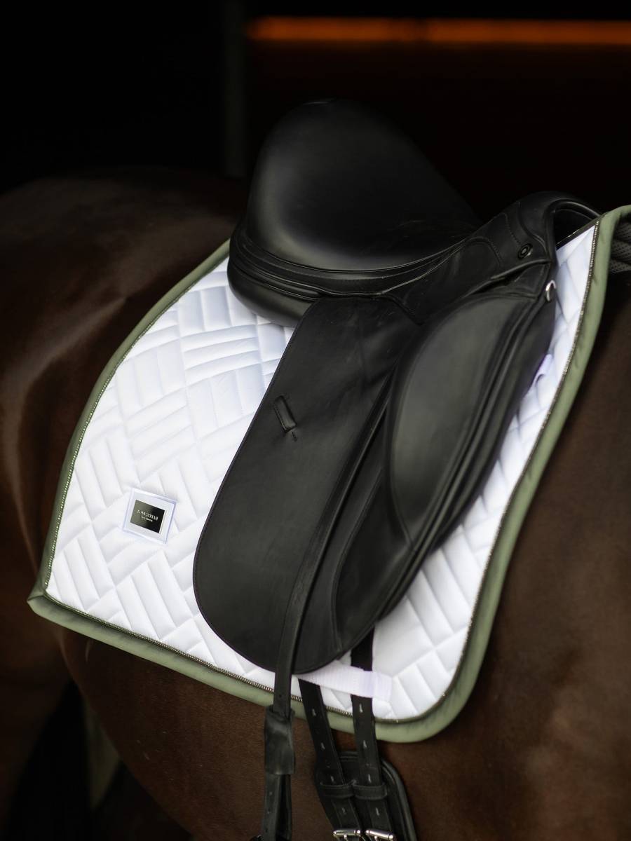 Tapis de selle élégant avec surpiqures modernes blanc et détails vert olive et argent. Décoré d'un badge Equestrian Stockholm en argent.