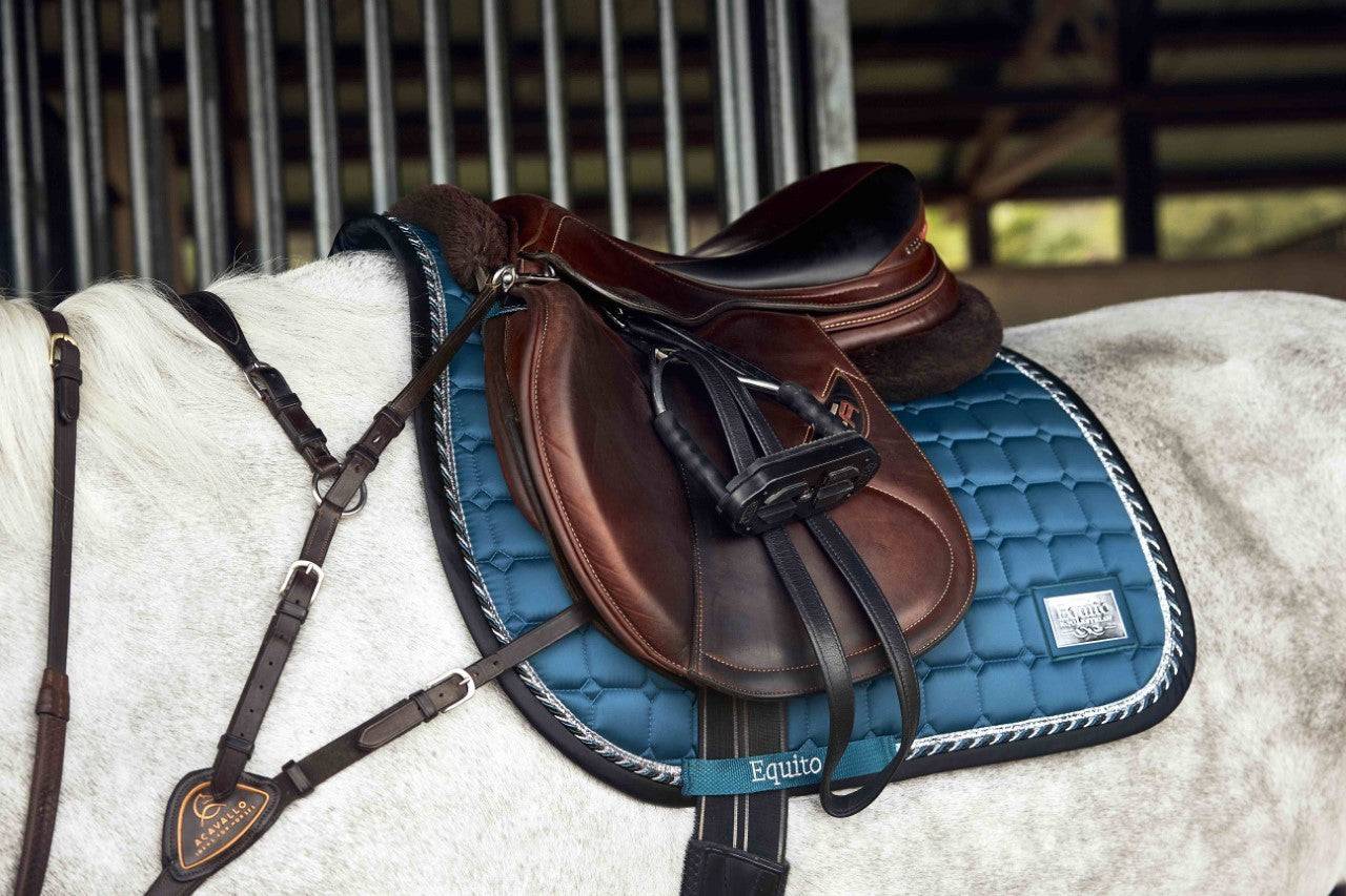 Un tapis de selle en coton bleu canard, alliant élégance et confort.
